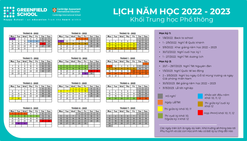 Greenfield School xin trân trọng thông báo lịch năm học cấp Tiểu học, THCS và THPT. Quý Phụ huynh vui lòng chọn cấp học theo khu vực trong bảng dưới đây để theo dõi nội dung tương ứng: