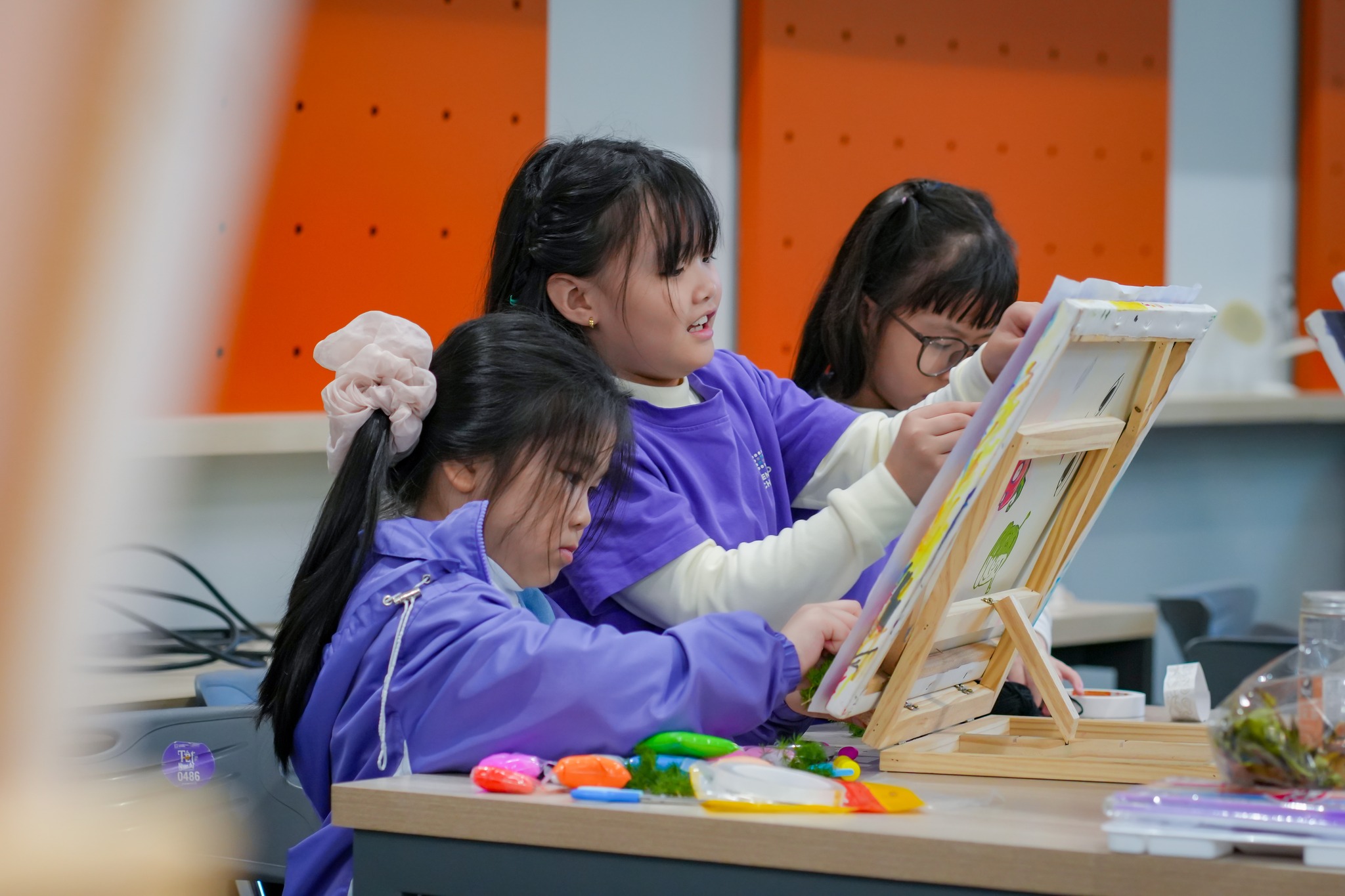 Tại hội trường hôm nay, các con bước vào phần thi cuối cùng: hoàn thiện trang trí cho bức tranh trước khi thuyết trình. Chỉ trong 20 phút, các chi tiết được khéo léo bổ sung, rồi từng con tự tin trình bày ý tưởng, ý nghĩa của từng nét vẽ và lý do lựa chọn chất liệu. Qua phần chia sẻ ấy, Ban Giám khảo, ba mẹ và các bạn học sinh khác có thể hiểu hơn câu chuyện mà mỗi bức tranh muốn truyền tải.