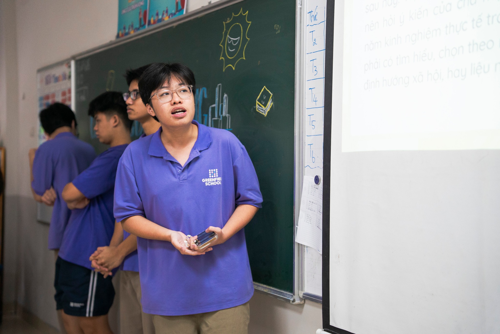 Sau hơn một tháng thực hiện, các con học sinh hai lớp 11G1 và 11G2 đã có buổi báo cáo tổng kết dự án. Trong vai trò những “phóng viên trẻ”, các con làm việc theo nhóm và trực tiếp phỏng vấn sinh viên, cựu sinh viên đã tốt nghiệp trong khoảng 5 năm gần đây. Qua đó, các con rèn luyện các kỹ năng quan trọng như đặt câu hỏi, khai thác thông tin, phân tích và phản tư phục vụ cho định hướng nghề nghiệp của chính mình.
