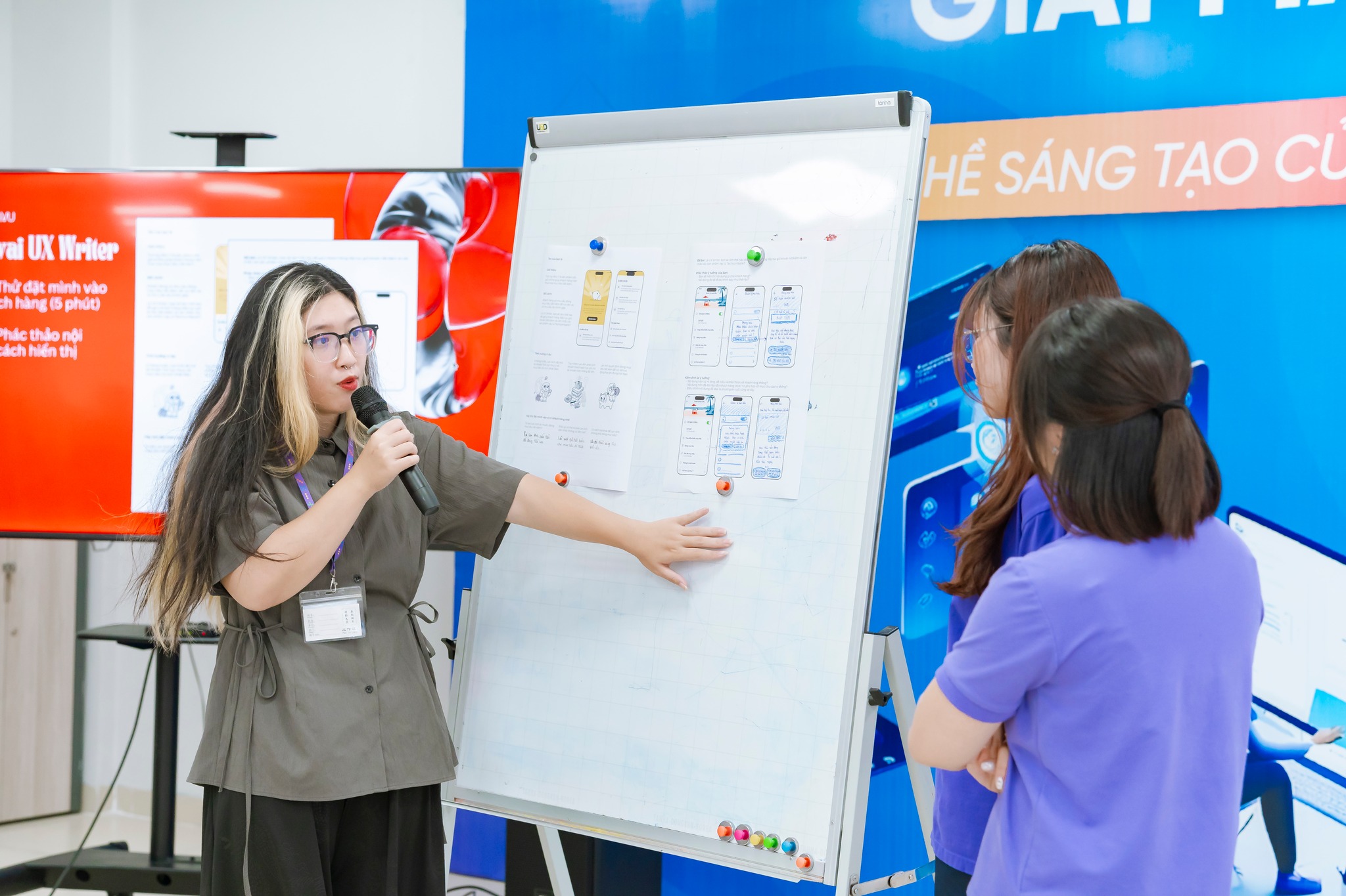 Không chỉ tiếp thu lý thuyết, các con học sinh còn được trực tiếp nhập vai UX Writer thông qua hoạt động nhóm bằng cách ứng dụng Design Thinking (Tư duy thiết kế). Với nhiệm vụ thiết kế một màn hình sản phẩm theo tình huống giả định, các con đã trải nghiệm phần nào công việc thực tế của một UX Writer. Bên cạnh đó, trong phần chia sẻ về kỹ năng nghề nghiệp, chị Hằng Vũ cũng phân tích ba nhóm kỹ năng cần thiết của người làm UX gồm kỹ năng chuyên môn, kỹ năng mềm và kỹ năng bổ trợ.