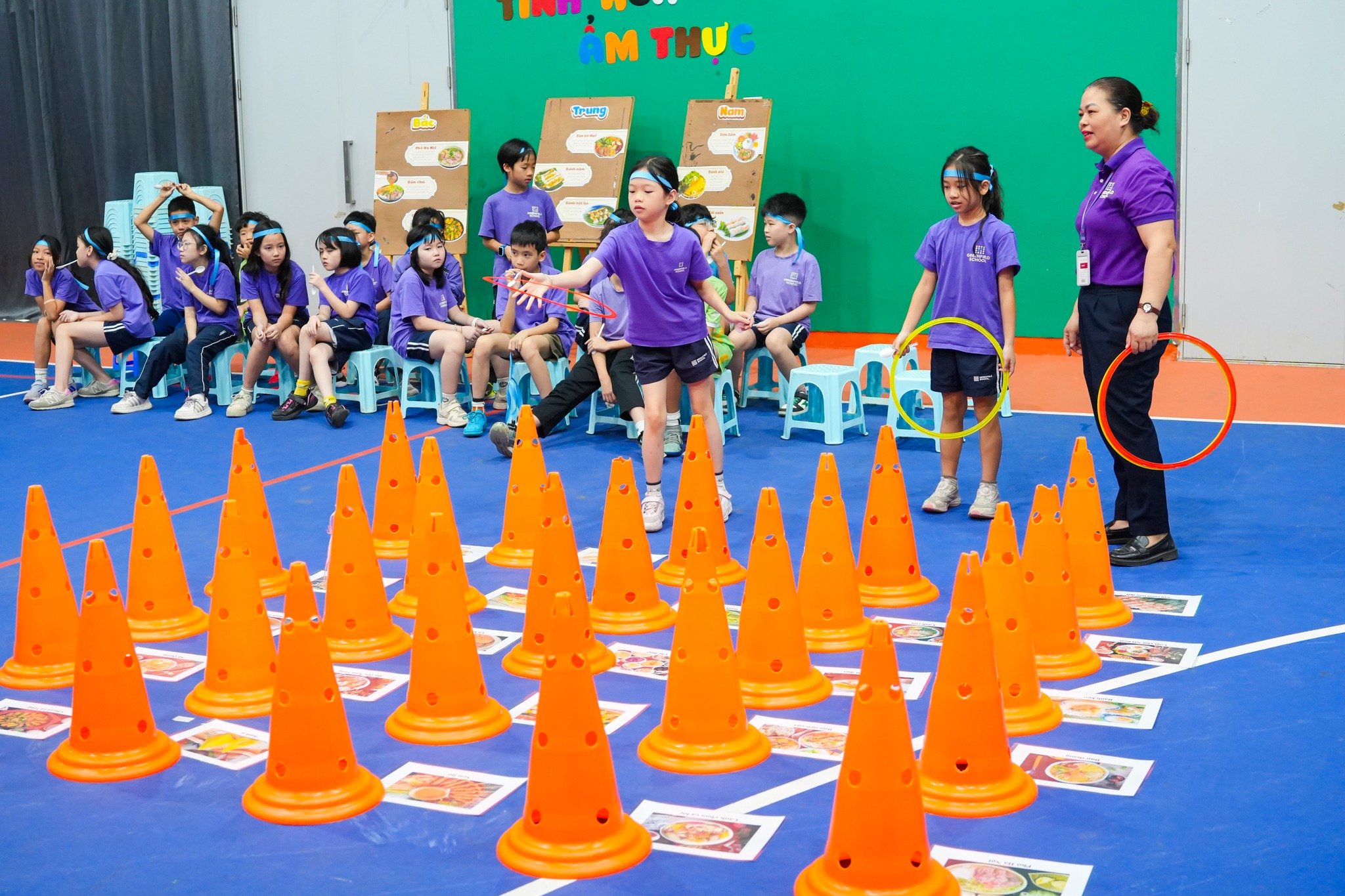 + Tụ điểm 2 - Tinh hoa ẩm thực: Một thử thách đòi hỏi sự khéo léo khi các con phải ném vòng vào các món ăn đặc sản trên sân khấu để nhận thẻ tên, sau đó đặt thẻ lên thìa nhựa và vượt chướng ngại vật để mang về đúng rổ miền tương ứng. Hoạt động này giúp các bạn nhỏ khắc sâu kiến thức về tinh hoa ẩm thực của từng vùng miền.