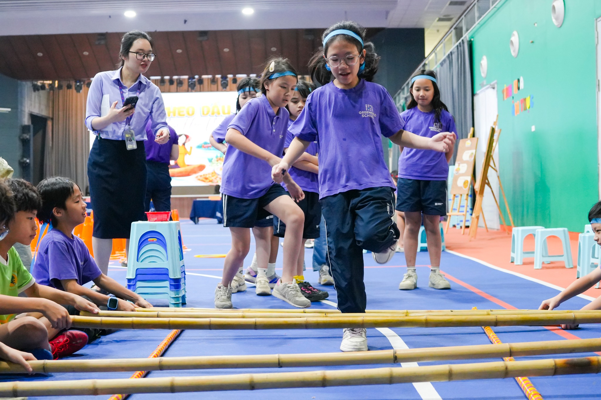 +Tụ điểm 3 - Sắc màu hội Việt: Không khí lễ hội rộn ràng bao trùm khi các cặp đôi cùng tham gia thử thách vận động liên hoàn. Các con phải phối hợp nhịp nhàng trong phần thi nhảy bao bố lấy hoa và nhảy sạp mang hoa về đích, qua đó rèn luyện thể chất và tinh thần đồng đội gắn kết.