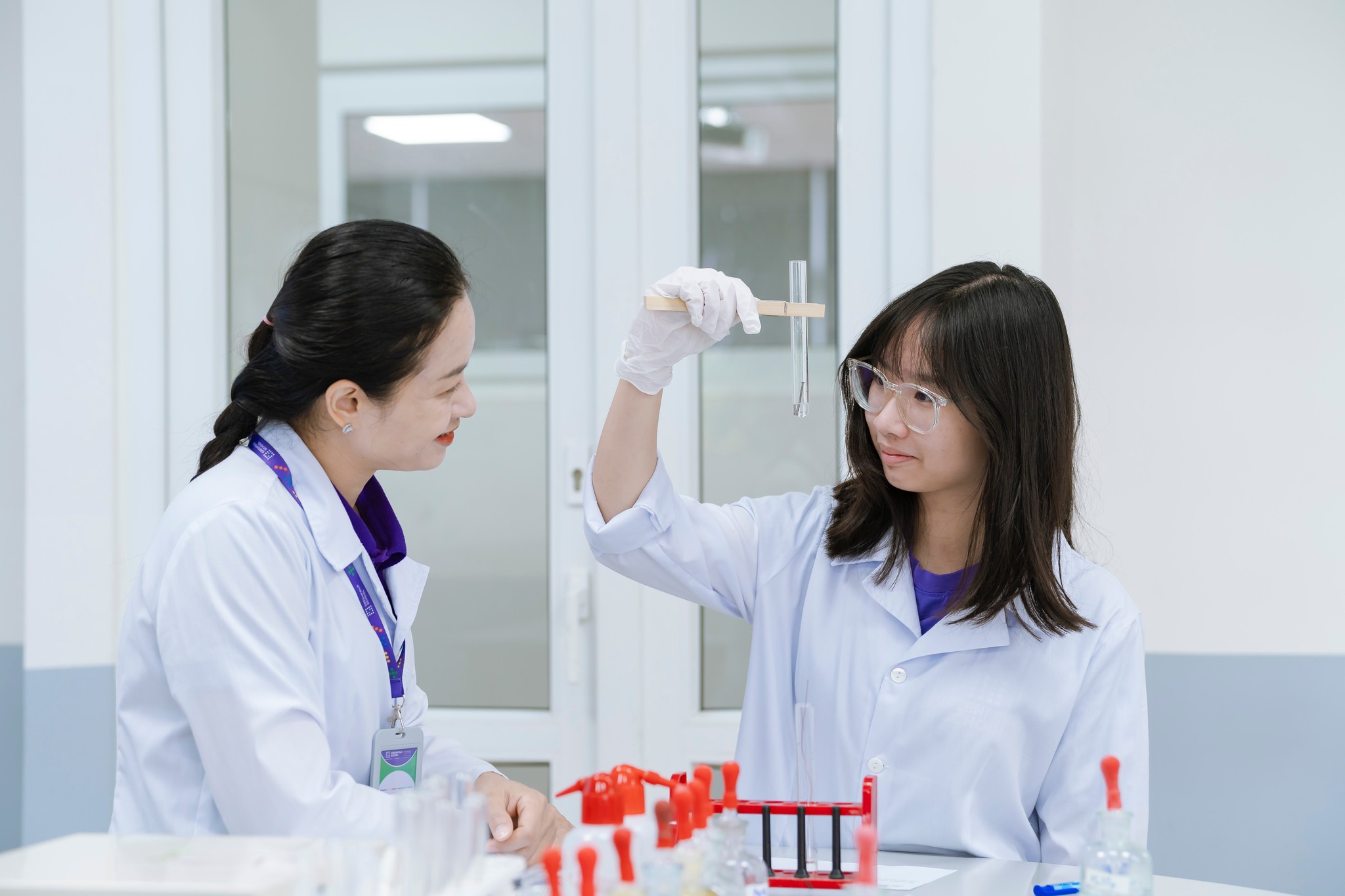 Trong phòng thi, cùng cảm giác hồi hộp xen lẫn háo hức, từng thao tác như kẹp ống nghiệm, lấy hóa chất, nhỏ dung dịch… đều cần sự tỉ mỉ và tập trung. Qua thí nghiệm, các con chăm chú quan sát dấu hiệu phản ứng: sủi bọt khí, dung dịch đổi màu, kết tủa xuất hiện, tỏa nhiệt… và nhiều hiện tượng khác.