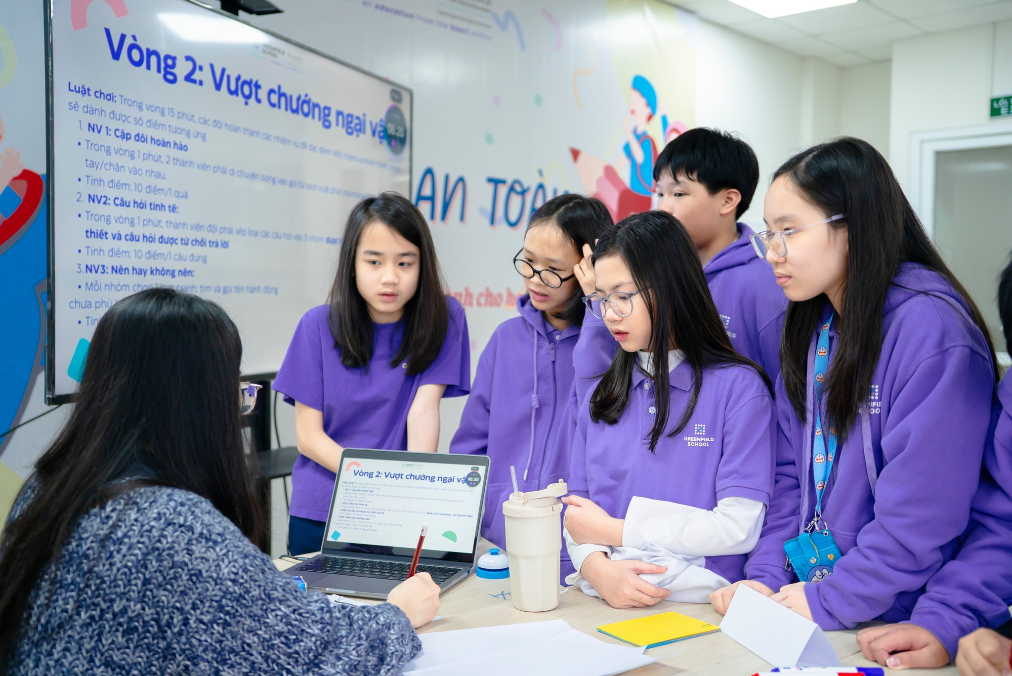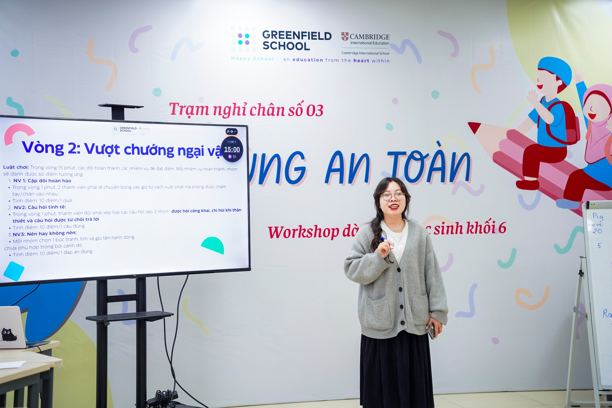 Buổi workshop được tổ chức dưới dạng 3 vòng chơi liên hoàn, giúp các con học sinh từng bước nhận diện cảm giác an toàn – không an toàn trong các tình huống quen thuộc. Thông qua việc ghép tình huống, vượt thử thách và phản hồi nhanh, các con được đặt vào những kịch bản gần với đời sống học đường để quan sát cảm xúc, phản ứng và lựa chọn cách ứng xử phù hợp.