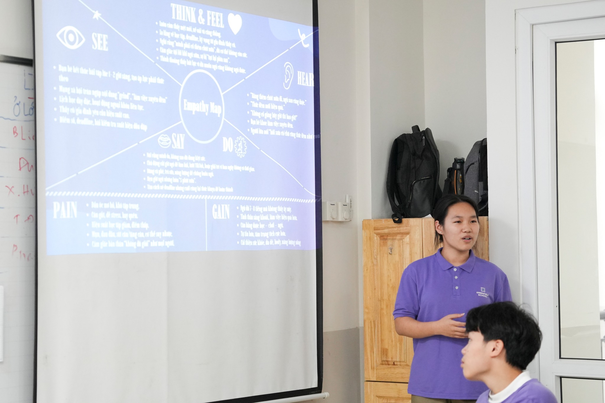 Không chỉ dừng lại ở ý tưởng sáng tạo, các con đã tự tin trình bày những Bản đồ thấu cảm (Empathy Map) - công cụ thấu hiểu người dùng chi tiết, những phân tích logic qua Mô hình Cây vấn đề (Problem Tree) và mang đến lớp những Mẫu thử (Prototype) trực quan – từ mô hình sản phẩm, giao diện ứng dụng đến các kịch bản trải nghiệm thực tế.