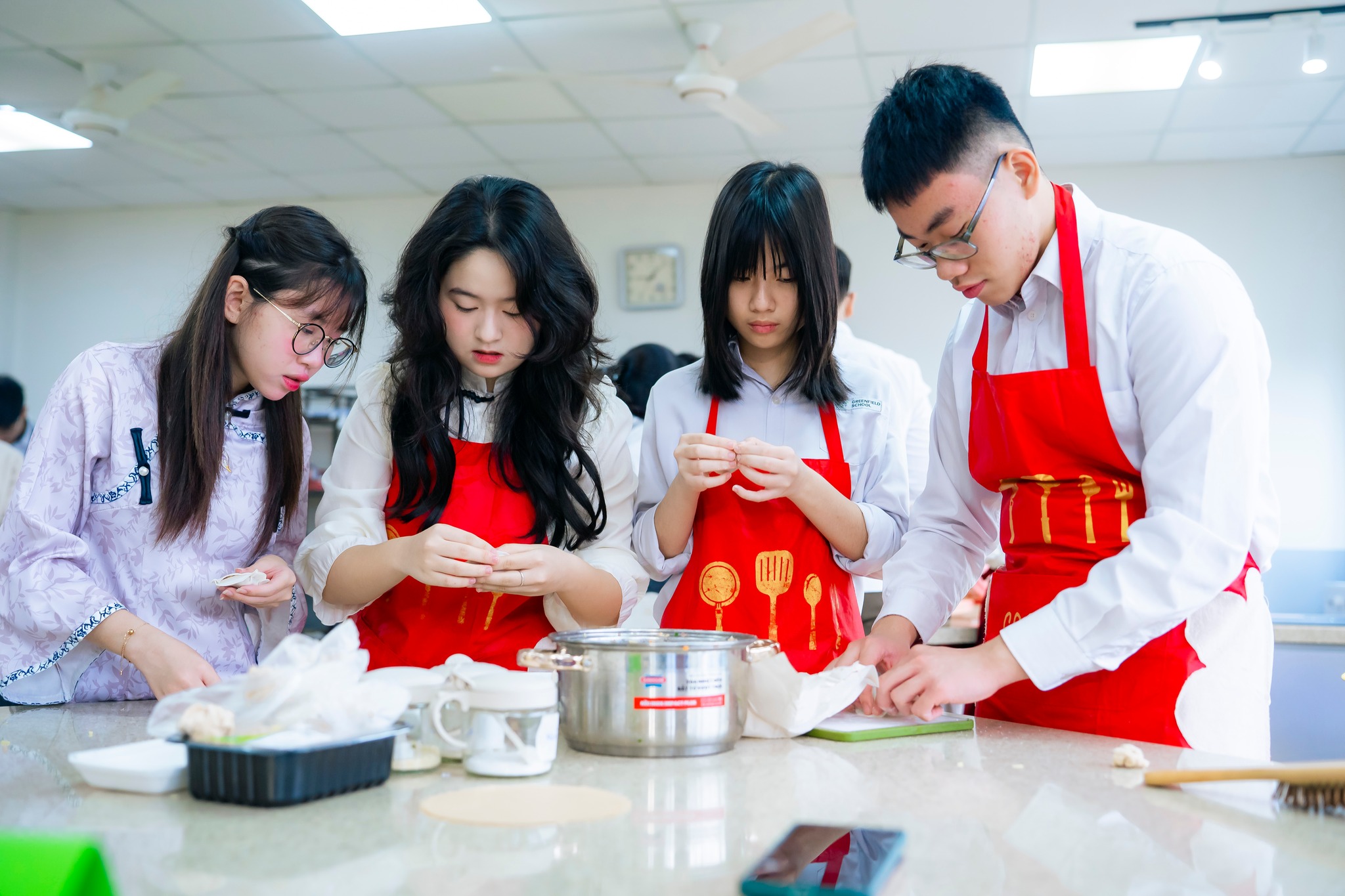 Giữa tiết trời se lạnh những ngày cuối năm, được cùng nhau gói sủi cảo và thưởng thức những chiếc sủi cảo thơm ngon, nóng hổi là khoảnh khắc thật đáng nhớ với các con học sinh. Bảo Hà (12C1) chia sẻ đây là lần đầu tiên con được làm sủi cảo, và hoạt động này đã giúp con mở rộng vốn kiến thức về văn hóa thế giới. Còn Minh Tâm (10G4) cảm thấy từ việc tìm hiểu về văn hóa, việc học tiếng Trung với con trở nên tự nhiên hơn.