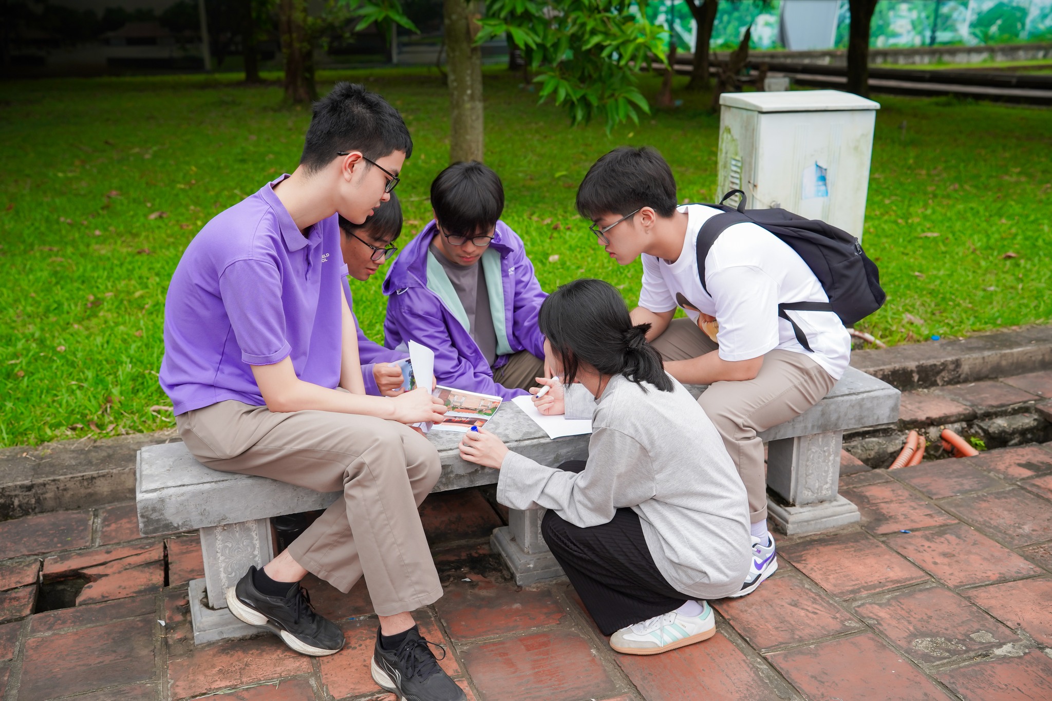 Cùng nằm trong hành trình khám phá, các con đến tham quan Thành cổ Sơn Tây – Di tích lịch sử quốc gia mang đậm dấu ấn kiến trúc triều Nguyễn. Tại điểm dừng chân này, các con học sinh đã tham gia hoạt động học tập “Khám phá di sản Thành cổ Sơn Tây và Làng cổ Đường Lâm” với nhiều thử thách thú vị. Toàn khối được chia thành ba nhóm: hướng dẫn viên du lịch, kiến trúc sư và nhà khoa học. Mỗi nhóm đảm nhiệm nhiệm vụ riêng như thiết kế tour du lịch, tái hiện công trình di tích bằng vật liệu cho sẵn hay giải mã “mật thức” kiến thức đã được tìm hiểu.