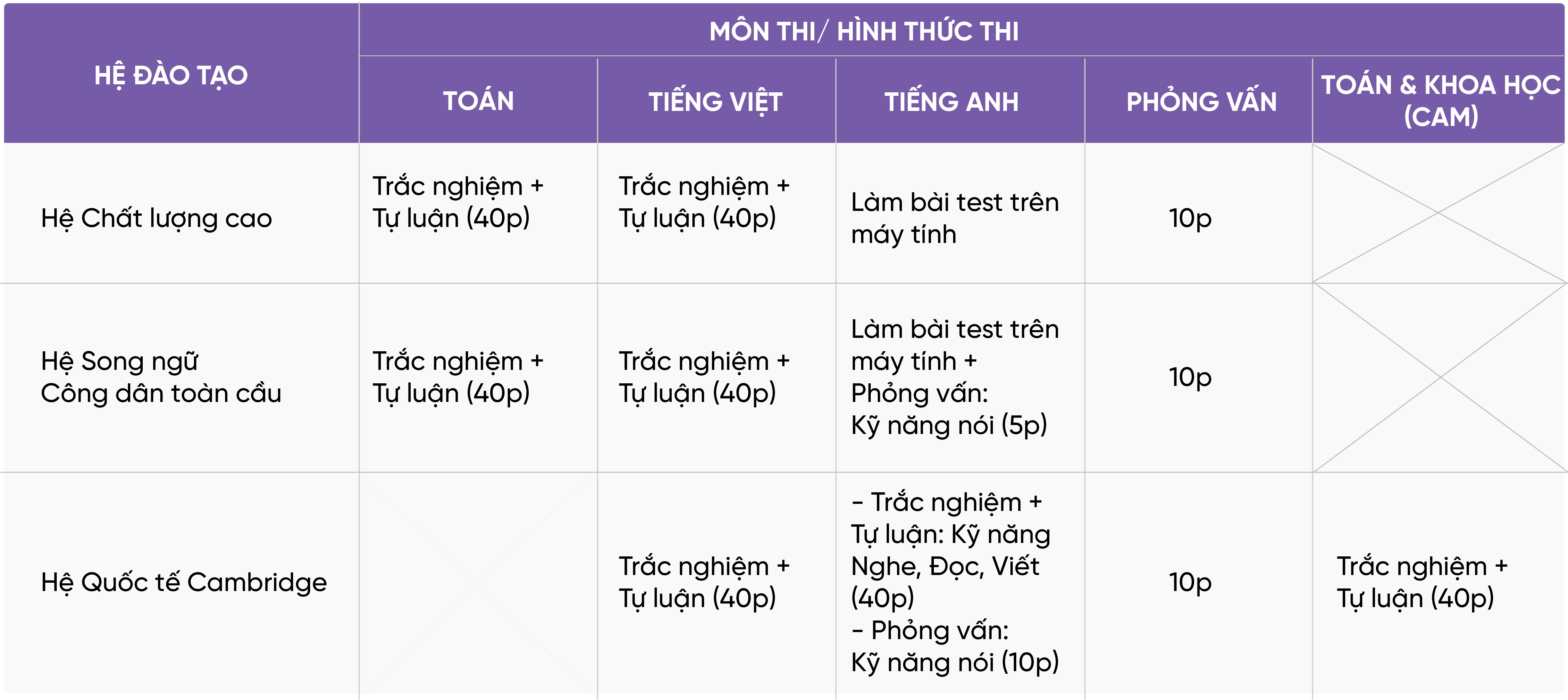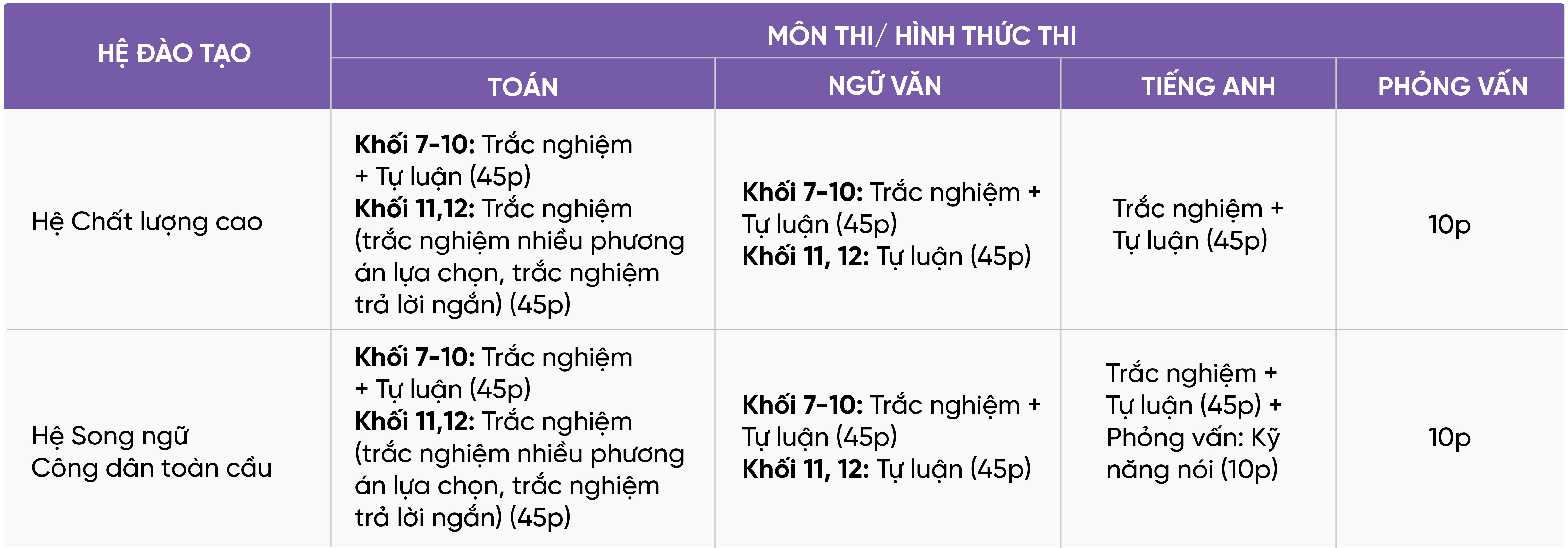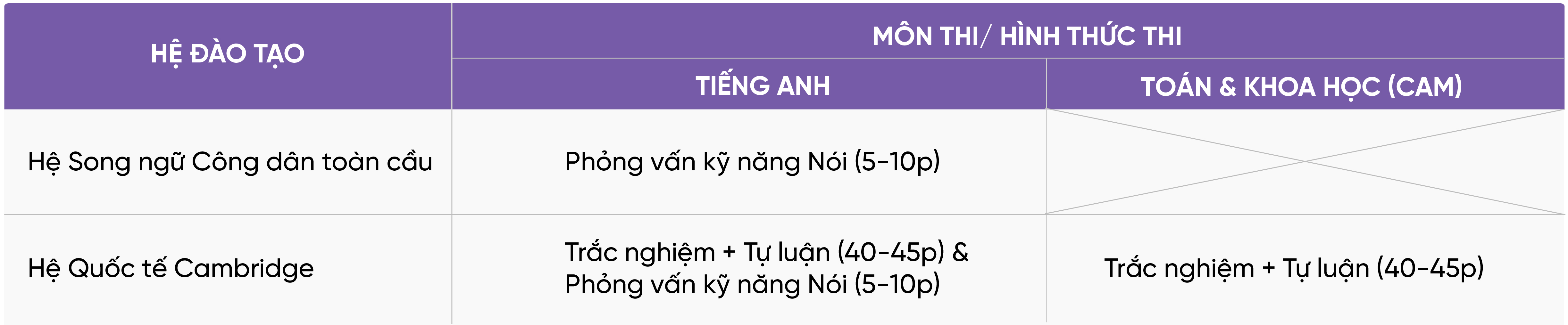3.1. Đối với học sinh có kết quả Trúng tuyển hệ Chất lượng cao, nhưng có nhu cầu chuyển sang các hệ (i) Song ngữ Công dân toàn cầu; hoặc (ii) Quốc tế Cambridge, cần phải thực hiện bài thi kiểm tra năng lực theo yêu cầu mỗi hệ, được quy định như sau: